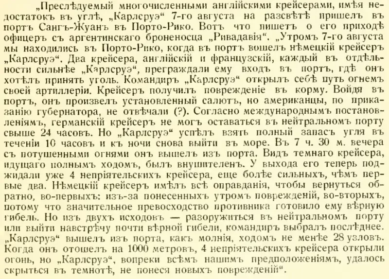 Как я понимаю, на самом деле все было гораздо скучнее. «Карлсруэ» после бегства от британских крейсеров испытывал крайнюю потребность в угле, отчего вынужден был сбросить ход до 16, а потом и до 12 узлов и идти в американский порт Сан-Хуан на Пуэрто-Рико. На крейсере слышали переговоры английских крейсеров и ожидали, что «Карлсруэ» будет вот-вот перехвачен. В этом случае германский корсар был бы обречен, потому что запасов угля ни для бегства, ни для боя у него не было. Но все обошлось, так что «Карлсруэ» добрался-таки до американцев, имея всего только 20 или даже 12 тонн угля в ямах. Никаких героических прорывов как в порт, так и из оного совершать не пришлось – немцы вполне мирно пополнили свои угольные запасы.
