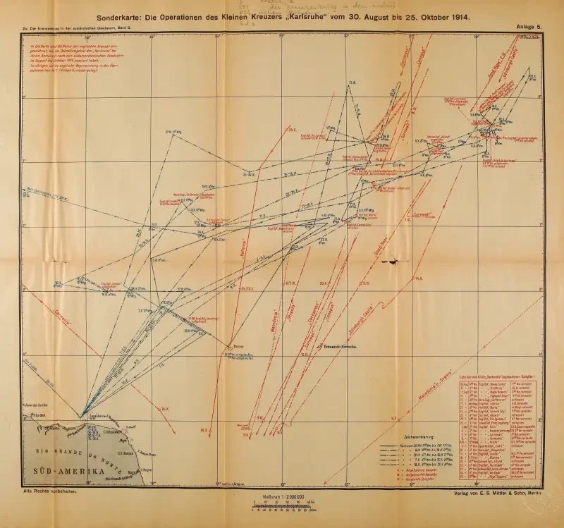Кризис миновал, и германский крейсер вышел на коммуникации неприятеля. Там он, не встречаясь более с неприятельскими крейсерами, весьма отличился, перехватив и утопив 17 судов тоннажем в 72 805 регистровых тонн. С этими тоннами вечно получается путаница, поэтому уточню, что регистровая тонна — это внутренний объём судна в размере 100 кубических футов (2,83 м3), причем имеется в виду только объем, предназначенный для перевозки грузов, но никак не водоизмещение корабля, которое вполне может быть вдвое больше.