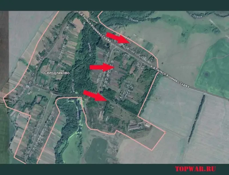 К настоящему моменту поступает информация о том, что после форсирования реки Локня более трёх четвертей площади села Свердликово перешло под контроль российской армии.
