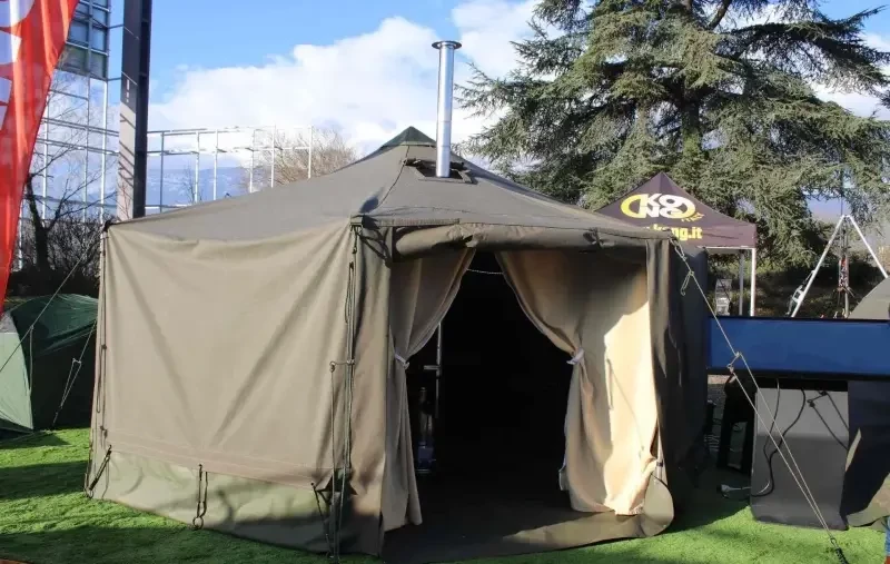 Среди других новинок, продемонстрированных на выставке, фигурирует палатка, разработанная компанией Trigano. Её площадь составляет 12 кв. м. Она имеет алюминиевый каркас с центральной регулируемой мачтой и 8 боковыми стойками, обеспечивающий оптимальную устойчивость. Используемая ткань – поликоттон IR M2 плотностью 530 г/кв. м. Сборка занимает всего 10 минут.