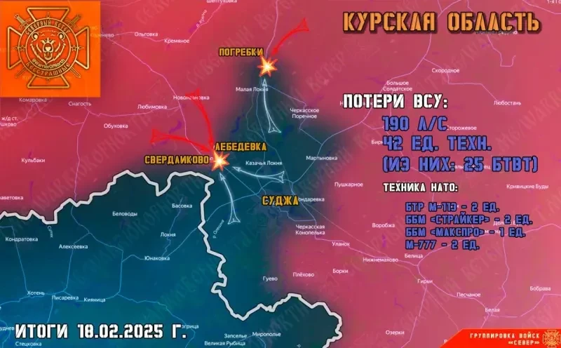 Хорошее продвижение «Бесстрашных» отмечается к западу от Суджи. Здесь, кроме Свердликово, наши активизировались в районе Лебедевки, где выбили противника из нескольких опорников на берегу реки Локня и продвинулись более чем на километр в окрестностях села. В районе Свердликово наши продвинулись в лесополосах, а также оседлали дорогу Рыльск — Суджа, начав движение в сторону районного центра. Правда, сама трасса заминирована противником. Враг попытался остановить наше продвижение к Судже, атаковав четырьмя БМП с десантом. В общем, бронетехника подбита, десантники разбежались кому повезло.