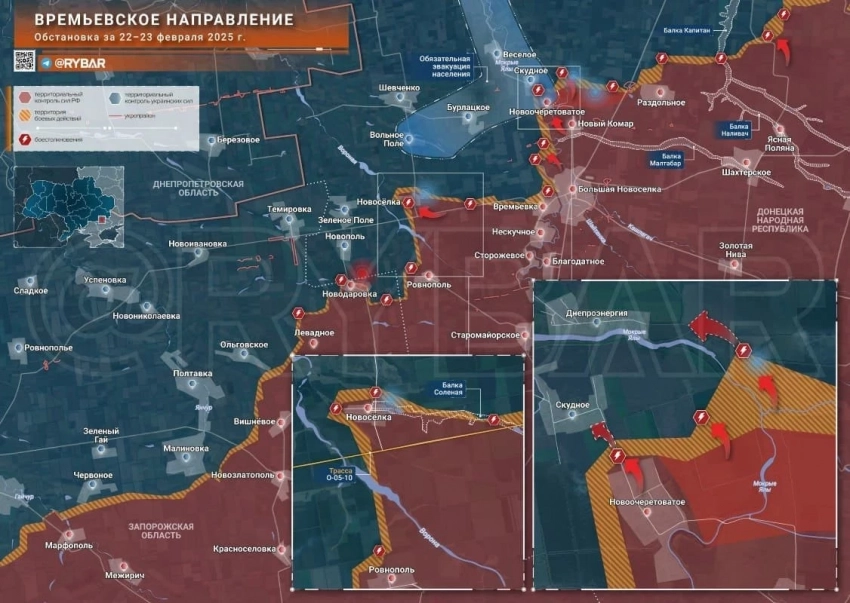На Угледарском фронте ВС РФ обходят две линии обороны ВСУ на стыке ДНР и Запорожской обл, двигаются на север вдоль реки Мокрые Ялы, штурмуя Скудное и Днепроэнергию. Кроме этого, наши укрепляют фланги этого прорыва, слева атакуя на Бурлацкое и приближаясь к Привольному, а справа – на район Раздольного. Ближайшая цель ВС РФ - Федоровка, куда ВСУ тянут резервы. Вероятно, после того как будет взят Константинополь и Богатырь, две российские группировки встретятся на рубеже Комар-Мирное-Поддубное. Здесь будет решаться судьба Западного Донбасса. Кроме этого, на северо-запад от Поддубного идёт дорога на Искру, контроль над которым открывает путь в Днепропетровскую обл и позволяет обойти все рубежи обороны ВСУ на Запорожском фронте. МО подтвердило освобождение села Улаклы, откуда уже сутки наши эвакуируют гражданских - люди сидели под отстрелами, чтобы дождаться прихода российских военных. Севернее наши бойцы, двигаясь на запад от Андреевки, захватили важный опорный пункт и зашли на окраины Алексеевки.