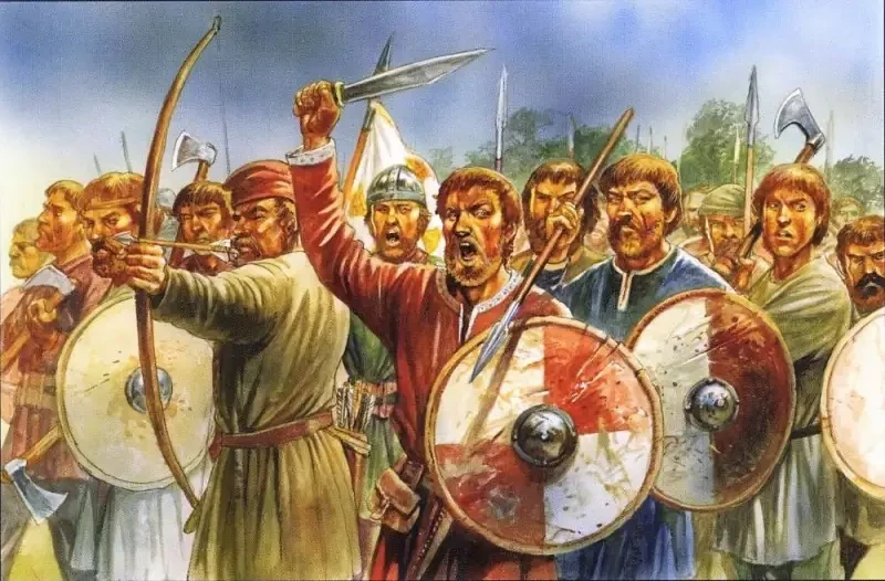 И с одной, и с другой стороны в составе сражающихся армий были лучники, но на тот момент ни англичане, ни их ближайшие родственники скандинавы это оружие не любили. Зато любили копья! Именно копьё указано как оружие большей части сражающихся, меч — оружие последнего шанса, за него берутся, когда копьё потеряно. При этом часто встречаются упоминания о метательных копьях — любовь англосаксов к дротикам известна.