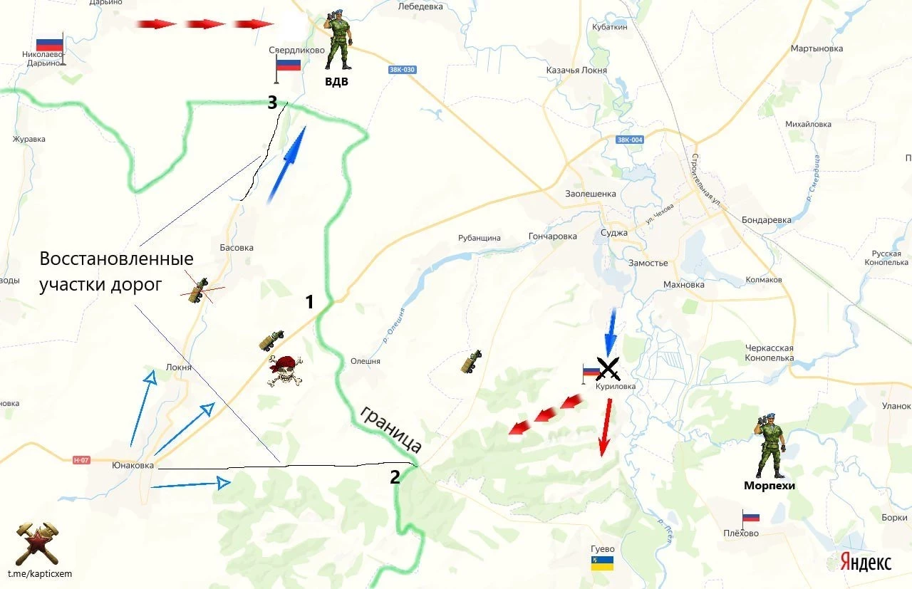 По данным канала, российские военные продолжают наступление на оборонительные позиции ВСУ в Суджанском районе, добиваясь тактических успехов вблизи Погребков.