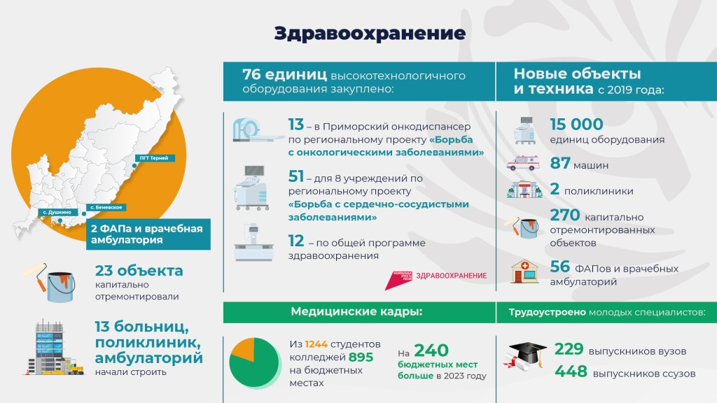 Провели капитальный ремонт на 23 объектах здравоохранения. Также в 2022 году началось строительство 13 новых больниц, поликлиник, амбулаторий. Они будут сданы до конца 2025 года.