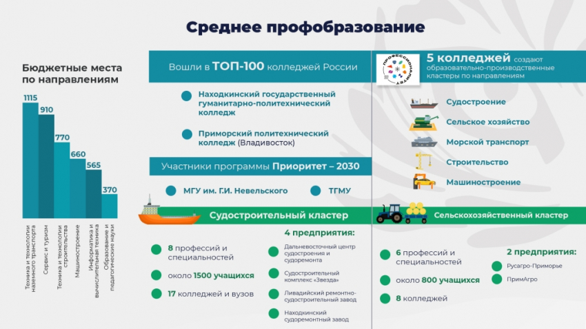 Пять колледжей получили поддержку на создание образовательно-производственных кластеров в рамках федерального проекта “Профессионалитет”. Направления: “Судостроение”, “Сельское хозяйство”, “Морской транспорт”, “Строительство”, “Машиностроение”.