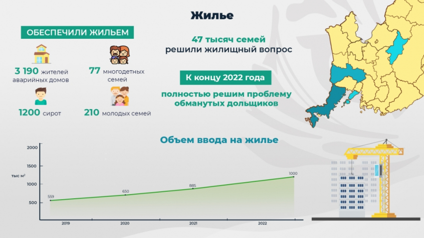 В 2022 году введено более одного миллиона квадратных метров жилья. Это самый высокий показатель за весь постсоветский период. 47 тысяч семей приморцев решили жилищный вопрос, в том числе с помощью “Дальневосточной ипотеки”.