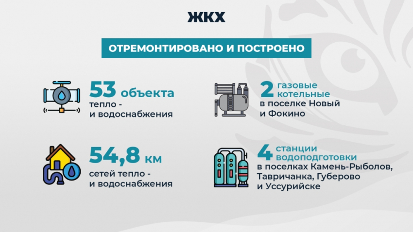 Мы построили стадионы в селе Михайловка и ФОК в Чугуевке. Завершили первый этап реконструкции стадиона “Авангард” во Владивостоке, отремонтировали стадион в Вольно-Надеждинском. В рамках подготовки к международным спортивным играм “Дети Азии” провели ремонты спортзала в Артеме, спорткомплекса “Олимпиец”, на стадионе “Динамо”.