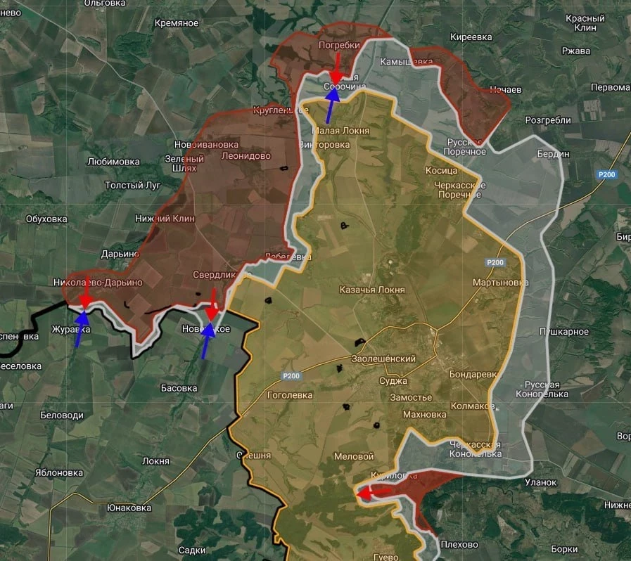 Российские войска давят с опорой на Николаево-Дарьино и Свердликово в направлении Сумской обл., имеют тактические успехи в районе Журавки и Новенького;
