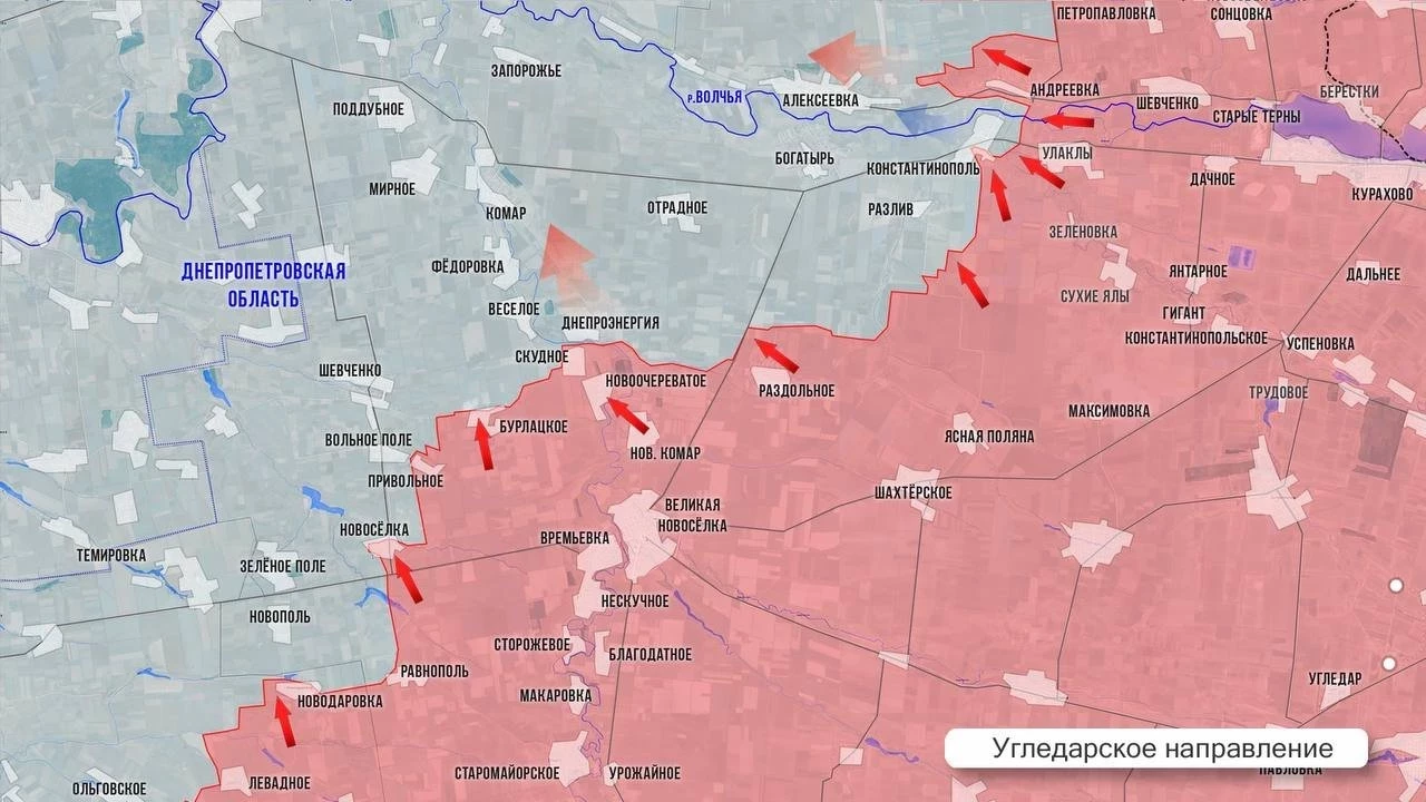 На Угледарском направлении армия России стабильно продвигается. Продолжаются бои в районе Вольного Поля и Днепроэнергии. После освобождения Константинополя усилилась активность на этом участке. К югу от Разлива ВС РФ продвинулись на 800 м. Западнее, между Раздольным и Богатырём продвижение составило до 300 м. На окраинах Алексеевки упорные бои.