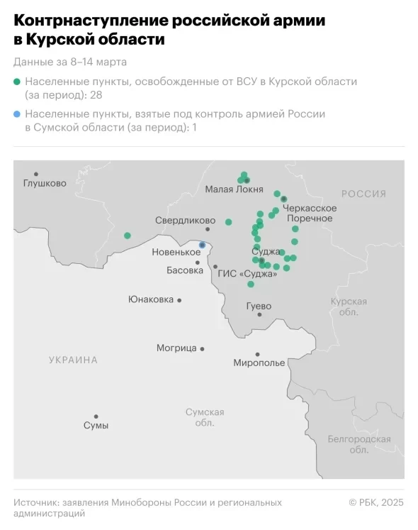 Минобороны РФ сообщило о взятии Суджи под контроль российскими военными в четверг, 13 марта. Город находился под оккупацией ВСУ с начала августа прошлого года.