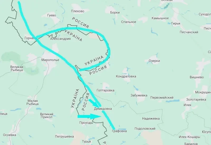 Враг таким образом пытается спасти положение в Курской области, расширив юго-восточный фланг и выстраивая линию Олешня – Горналь (оба села – Курская область) – Мирополье (Сумская область) - Демидовка – Графовка (оба села – Белгородская область, Краснояружский район).