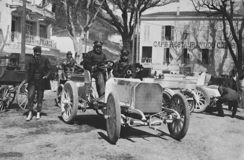 Вот он, легендарный Daimler Phönix, впоследствии ставший «Мерседесом». На фотографии версия 1897 года, за рулём Эмиль Елинек (Emil Jellinek), давший ему это имя.