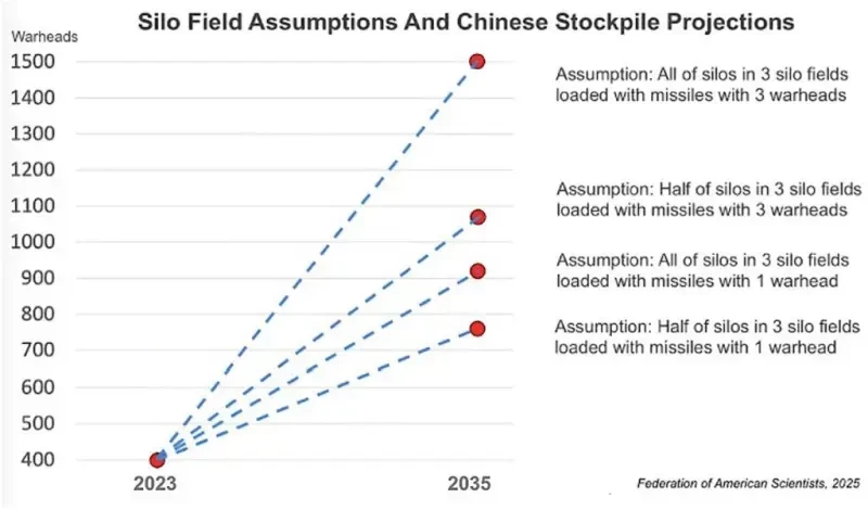 Рисунок 1. Предположения и прогнозы по шахтным пусковым установкам ядерного оружия Китая. Прогнозы по росту запасов ядерного оружия Китая в значительной степени зависят от предположений о том, как будут вооружены три новых позиционных района с развернутыми ШПУ твердотопливных МБР Китая. (Источник: Федерация американских ученых).