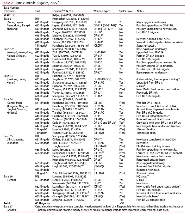 Таблица 2. Китайские ракетные бригады, 2025 г.