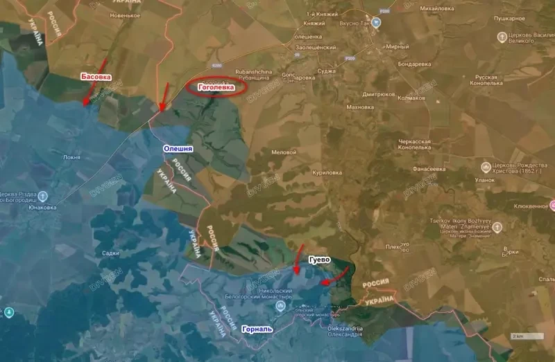 Таким образом, на данном участке под противником осталась только Олешня, которую наши обкладывают со всех сторон. Восточнее бои идут в Гуево, которое наполовину под контролем российских войск, да еще Горналь. Но его очередь тоже придет, остановить наступление ВС РФ у Киева не получается.