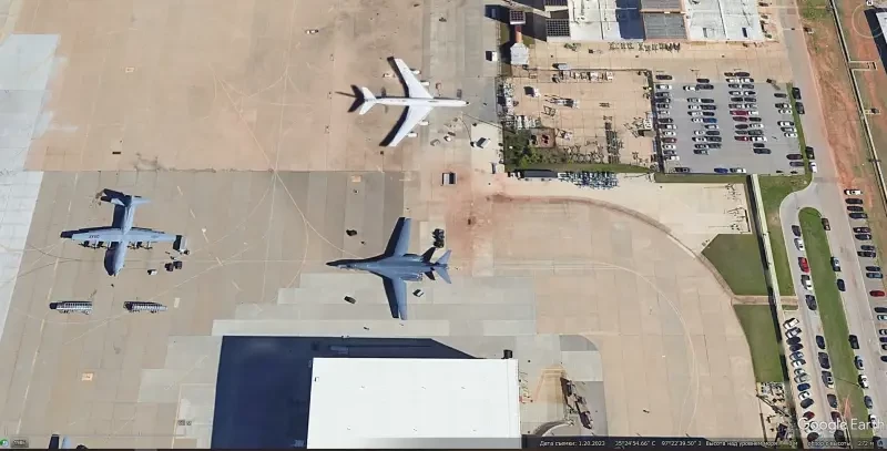 Спутниковый снимок Google Еarth: самолёты E-6В, С-130Н и В-1В на авиабазе Тинкер