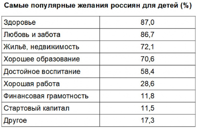 Отвечая на вопрос, что необходимо дать ребёнку, 87% россиян выбрали здоровье, почти столько же (86,7%) — заботу и любовь. Далее идут недвижимость (72,1%), приличное образование (70,6%) и достойное воспитание (58,4%). Хорошую работу своим детям желают 28,6% участников исследования, финансовую грамотность намерены привить 11,8%, сформировать стартовый капитал — 11,5%.