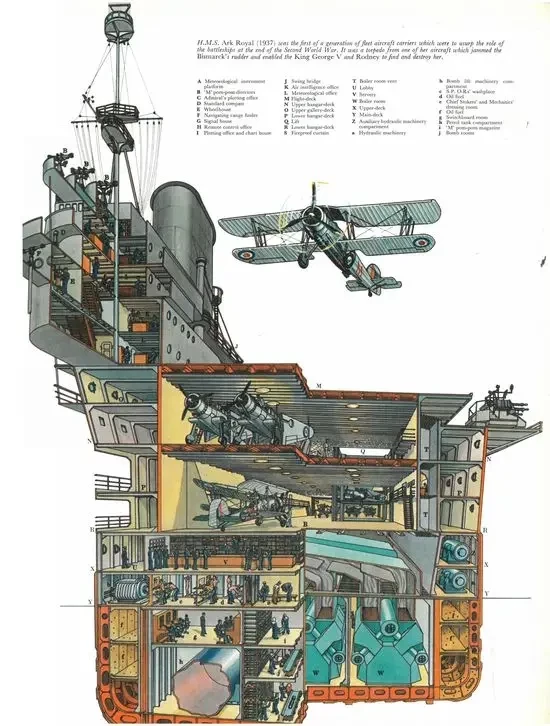 Авианосец «Арк Ройял» действительно был кораблем, который на ближайшие лет пятьдесят определил облик ударного авианосца, а вообще его схема с 9 палубами, 3-мя подъемниками и двойным ангаром стала классической.