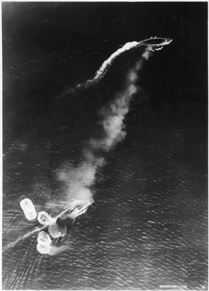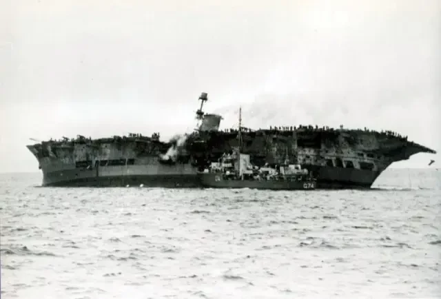 Эсминцы, которые проворонили подводную лодку, приступили к спасению экипажа авианосца, который в любой момент мог опрокинуться и затонуть. Это у них получилось значительно лучше, и за полчаса корабли сняли 1487 офицеров и матросов. Капитан и еще 100 человек команды остались на корабле бороться за его живучесть.