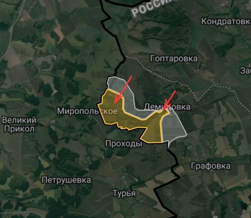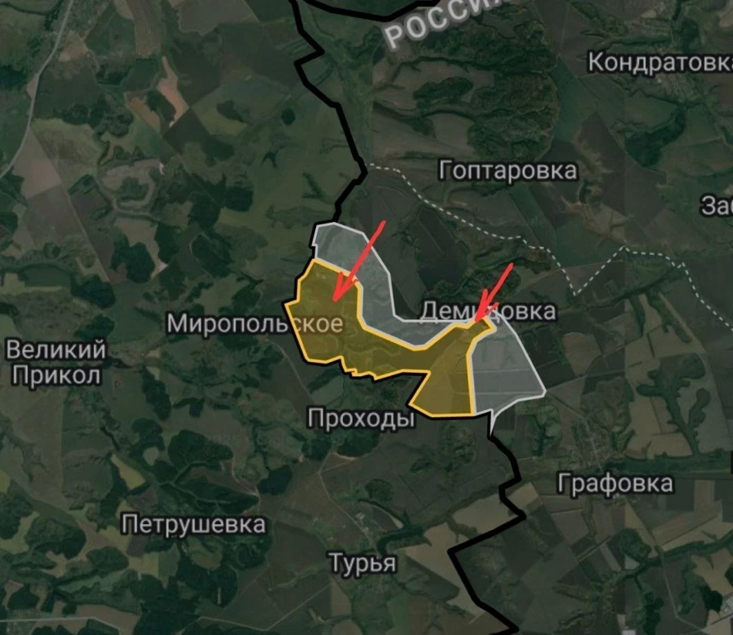 Российские войска наступают по линии Владимировка - Веселовка - Журавка, продавливая оборону противника в Сумской области. Украинские инженеры срочно возводят оборонительные укрепления в направлении к городу Сумы. До него от нашей границы по прямой около сорока километров.