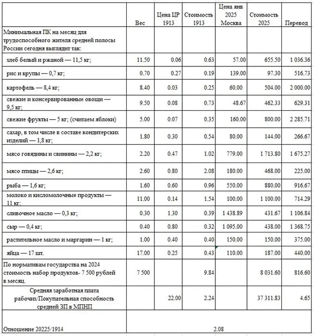 Сравнение покупательной способности: Россия 1914/2025: продукты питания