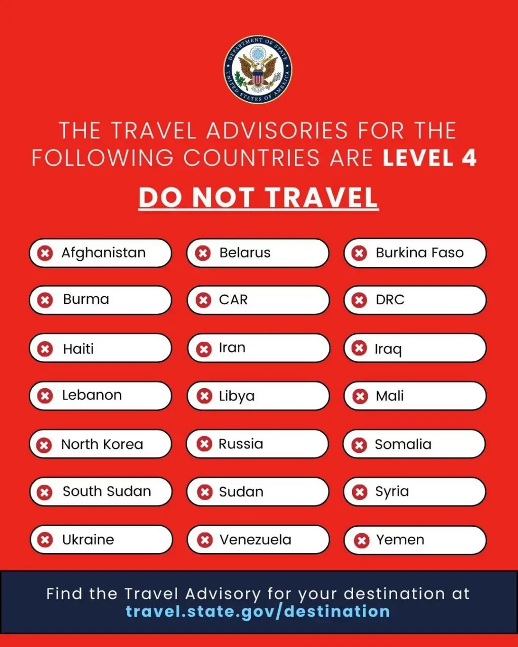 В списке значатся Афганистан, Иран, Ирак, Северная Корея, Венесуэла, Сомали, Судан, Сирия, Йемен и еще двенадцать государств, включая Белоруссию, Россию и Украину.