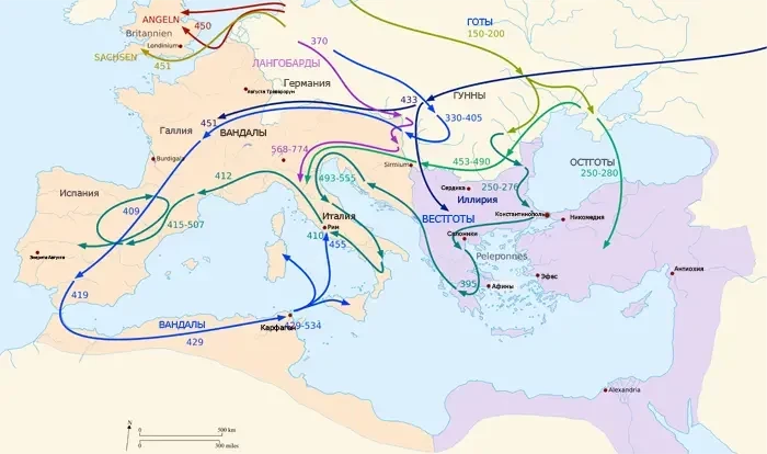 Карта примерного расселения варварских народов на территории Западной Римской империи во времена Великого переселения народов (ок. 300–600 гг. н. э.), также известного как варварские нашествия — периода в истории Европы, отмеченного масштабными миграциями варваров, которые привели к падению Западной Римской империи и последующему заселению ее различными племенами и созданию постримских варварских королевств. Источник: Eigenes Werk