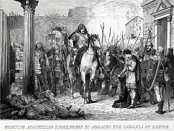 Германец Одоакр низлагает молодого императора Ромула Августула в 476 году. Бывший император Ромул Августул (Romulus Augustulus) все еще находился в Равенне, и Одоакр отправил его в изгнание. Судьба Августула, последнего императора Западной Римской империи, неизвестна, но считается, что Одоакр его сослал на виллу Лукулла в Кампании (регион в южной части Италии, Неаполь). Сослав молодого императора, отправив инсигнии императорской власти в Константинополь и став первым королем (rex) Италии, Одоакр тем самым поставил жирную точку на существовании всей Западной Римской империи. Его правление длилось более шестнадцати лет, характеризуясь уникальным сочетанием варварских и римских практик