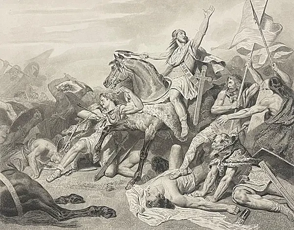 Сражения при Суассоне. Винтажная иллюстрация. Результатом этого сражения был конец Суассонского королевства, которое было ассимилировано во Франкское королевство, которое к 555 году н.э. уже включало в себя всю Галлию, а варварские германские королевства, которые первоначально параллельно сосуществовали с римскими структурами, начали принимать и адаптироваться под римские законы, объединяясь в единую культурную общность. Это явление романизации германцев и германизации галло-римлян было ключом к формированию будущей политической и культурной идентичности в Западной Европе.