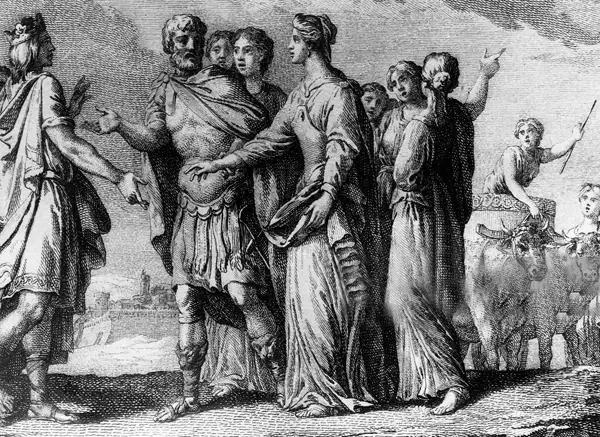 Встреча франкского короля Хлодвига с Клотильдой (Хродехильдой), дочерью бургундского короля Хильперика II и племянницей короля бургундов Гундобада. 493 год. Если верить летописям Григория Турского, то король выдал Клотильду за Хлодвига, боясь отказать могущественному франкскому королю. Гравюра Бернара Франсуа Леписи (1698-1755) и Жака-Филиппа Ле Ба (1707-1783). Источник: De Agostini Editorial