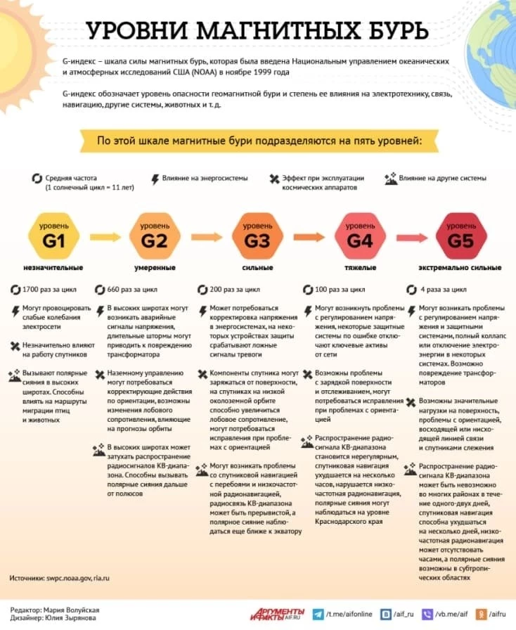 Уровни магнитных бурь и их последствия: инфографика