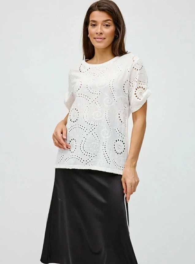Летние женские блузки — это не просто элемент гардероба, а то, что делает лето по-настоящему стильным. Эта блузка от Sansa — отличный пример сочетания удобства и модных трендов. Классический дизайн с укороченными рукавами и округлым вырезом создаёт ощущение лёгкости и свежести, а перфорация ткани добавляет изюминку. Изготовленная из 100% хлопка, она идеально подходит для жаркого лета, обеспечивая отличную воздухопроницаемость. Легкость материала и комфорт при носке делают её идеальной как для офисной обстановки, так и для университетских дней или летних вечеринок. Универсальный белый цвет легко комбинируется с любыми брюками, юбками и шортами, добавляя нотку сдержанного, но стильного шарма. Отлично подходя для девушек всех типов фигур, эта модель с прямым кроем также подойдёт дамам плюс сайз, благодаря своему свободному и комфортному силуэту. К тому же, она ещё и может стать частью школьной формы или офисного стиля, сочетая практичность с модой.