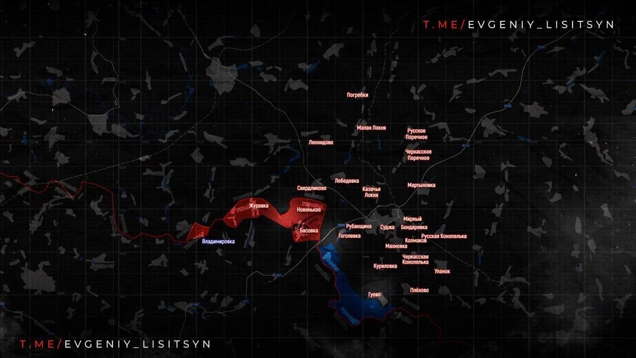 В Курской области официально подтверждено освобождение Гуево. ВС России ведут бои в Олешне и Горнали. Для уничтожения врага вблизи Олешни применяется ракетное вооружение. На Сумском направлении каналы противника сообщают о боях у Локни Юнаковского района Сумской области, которая южнее недавно взятой Басовки, что свидетельствует о дальнейшем вклинении ВС России в оборону врага.