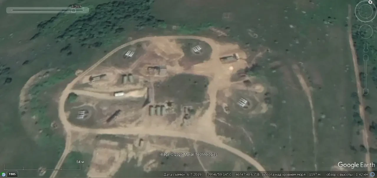 Спутниковый снимок Google Earth: позиция ЗРК С-125М1 в Бейлаганском районе Азербайджана, снимок сделан в марте 2025 года