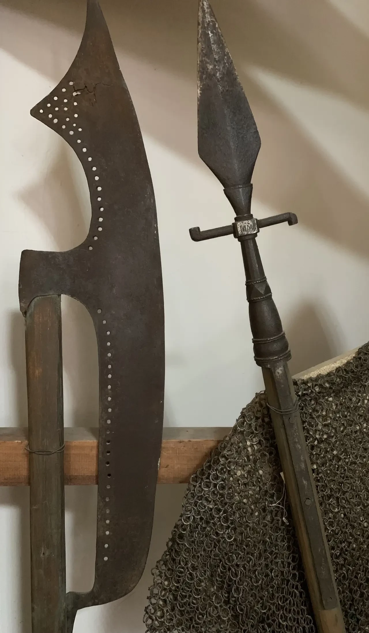 Бердыш городового стрельца (слева) и рогатина (справа). Отверстия на обухе бердыша служили для колец, которыми дозорные стрельцы гремели по ночам, обходя город дозором и пугая при этом «лихих людей», и давая знать решеточным (уличным сторожам, запиравшим каждый свою улицу на «решетку»), что надо выходить и… открывать им проход. То есть ходить ночами по улицам старорусских городов было совсем не легко, как говорится, ни пройти ни проехать! С рогатиной и охотились, и воевали. Поперечины на втулке наконечника не позволяли ему слишком уж углубляться в тело противника. Пензенский областной краеведческий музей. Фотография автора.