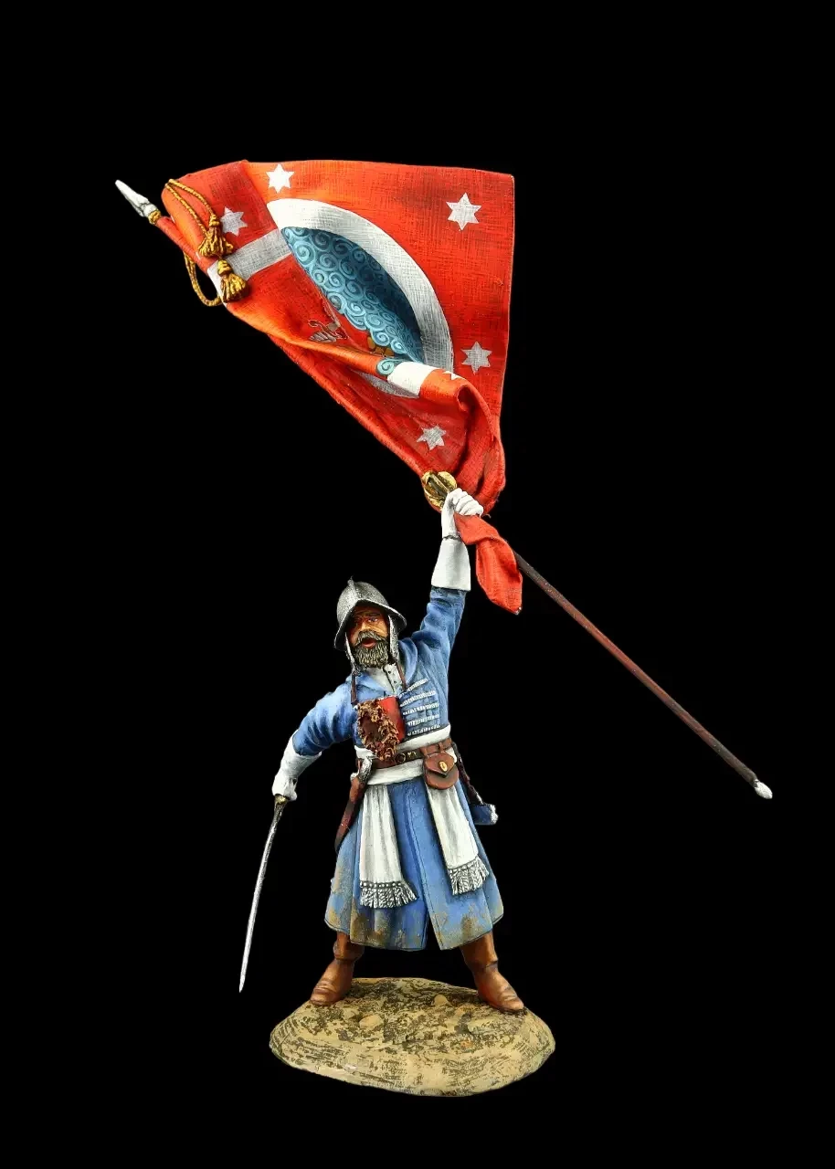 Знаменосец полка нового строя, XVII в. Знамена у полков, как стрелецких, так и солдатских, были трех типов: полковое (богато расшитое, редко выносившееся в строй), сотенные (ротные), часто шившиеся из ткани полковой униформы и обычно с цветным крестом, и небольшие «пятидесятские» или братские знамёна – по сути, это были небольшие флажки. Производители: «Silver Dream Studio» и «Triloka Miniatures».»