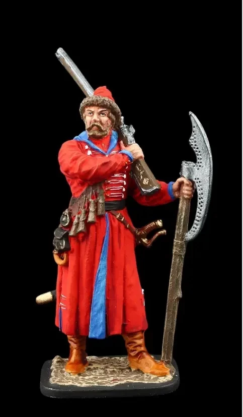 Московский стрелец XVII века, вооруженный фитильным ружьем и топором-бердышом, который он вполне мог использовать в качестве подставки при стрельбе. Правда, в настоящее время все больше пишут о том, что при стрельбе на бердыш стрельцы свое оружие не опирали. Есть и такое мнение, да. Производители: «Silver Dream Studio» и «Георгиевский Крест»