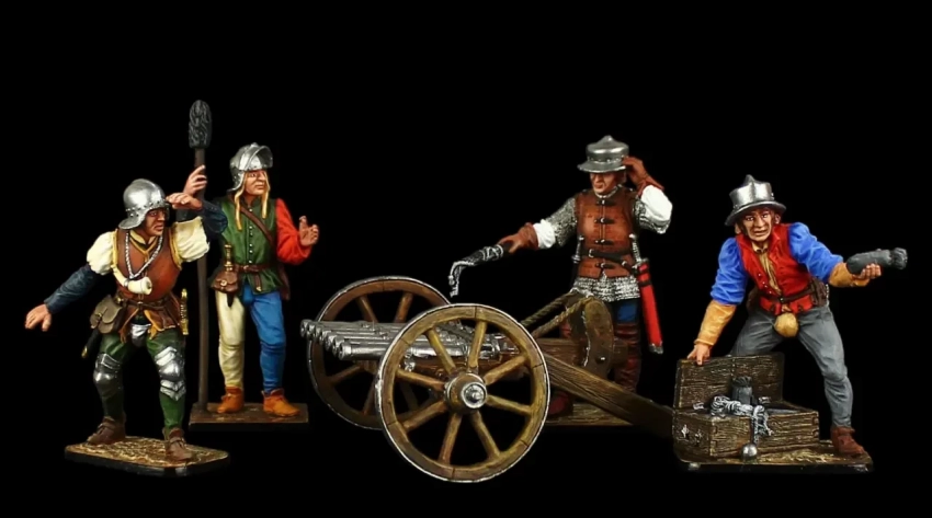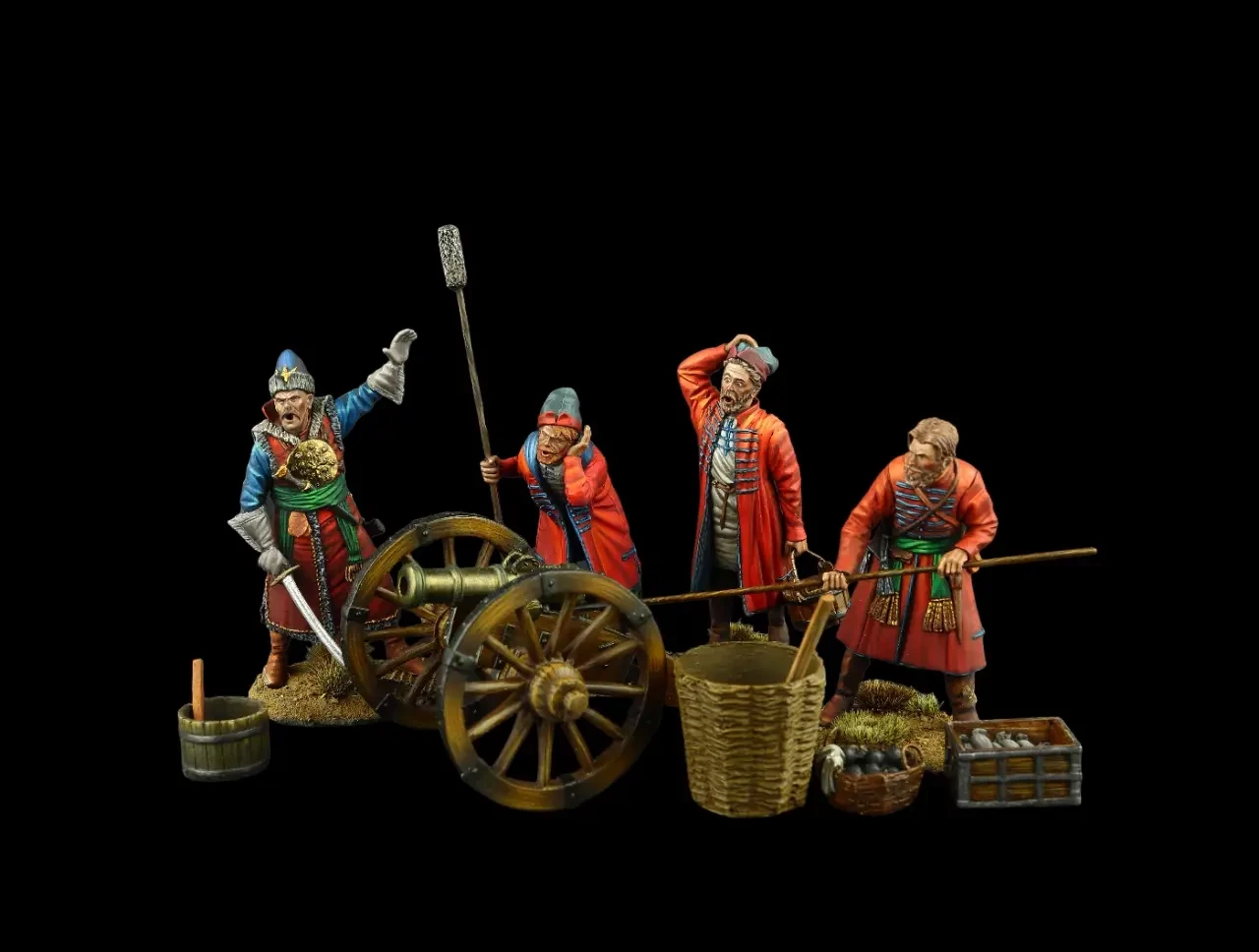 Русские артиллеристы XVII в. с пушкой. Начиная с Ивана Грозного Россия обладала самой многочисленной и могущественной артиллерией в Европе. Пушки отличались своим совершенством. Известны орудия, заряжавшиеся с казённой части, в том числе и с нарезными стволами. В этом случае они заряжались каменными или чугунными ядрами, облитыми снаружи свинцом, который легко вдавливался в нарезы при выстреле. Многие западные путешественники, побывавшие в России, с удивлением и восхищением писали о количестве и качестве российских пушек, как при Иване Грозном, так и при Алексее Михайловиче. В частности, шведский посланник Эрик Пальмквист писал, что у русских много хороших артиллеристов (пушкарей и затинщиков), которые «никогда не делают промахов». Артиллеристов отличали красного цвета кафтаны и при параде, а также командиров, медные (позолоченные) диски («аламы») на груди с изображением двуглавого орла с распростёртыми крыльями, держащего в когтях пушечный ствол и пальник, а также львиной головы с пушкой во рту. Производители: «Silver Dream Studio» и «Triloka Miniatures»