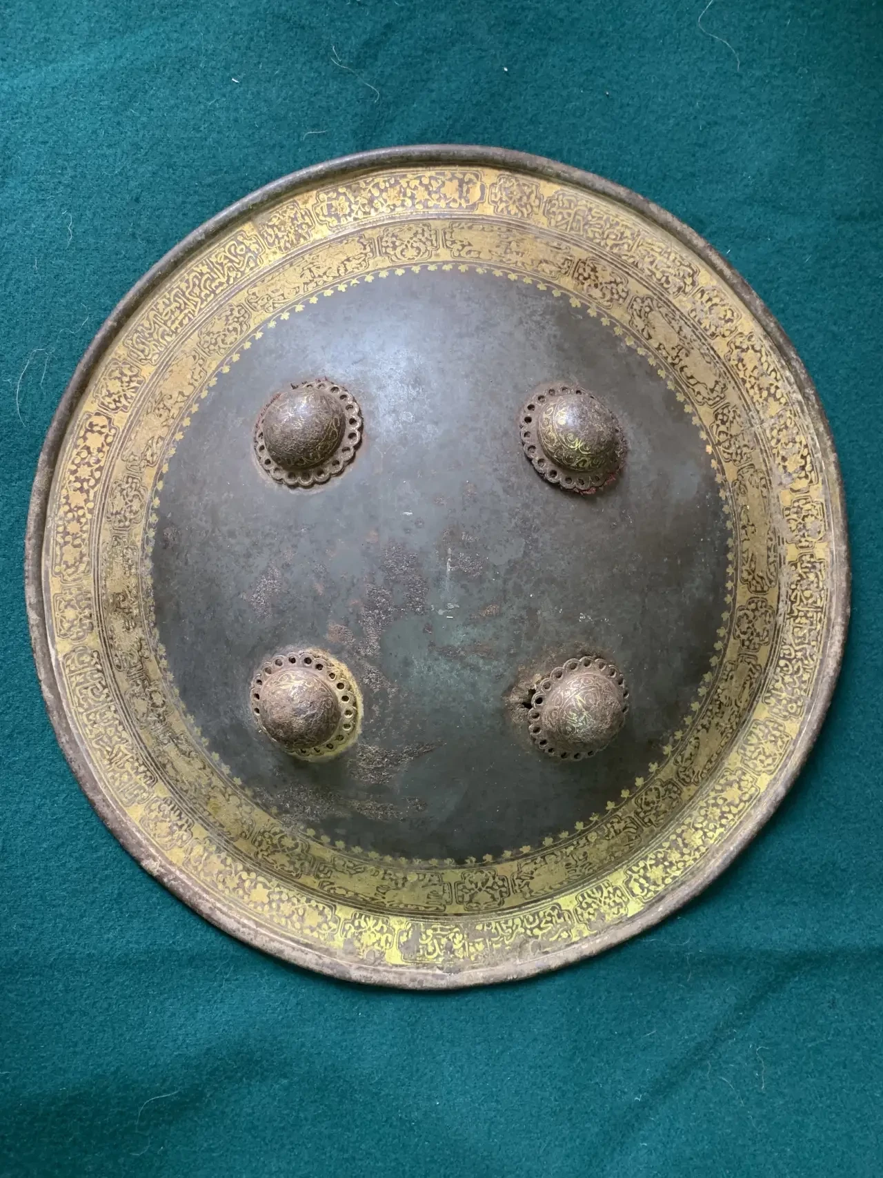 Популярным видом защитного вооружения XVII в. на Востоке оставался щит небольшого размера, сделанный из нескольких слоёв кожи или целиком выкованный из меди или бронзы. Неудивительно, что они очень часто попадали к нам в качестве трофеев. Пензенский областной краеведческий музей. Фотография автора