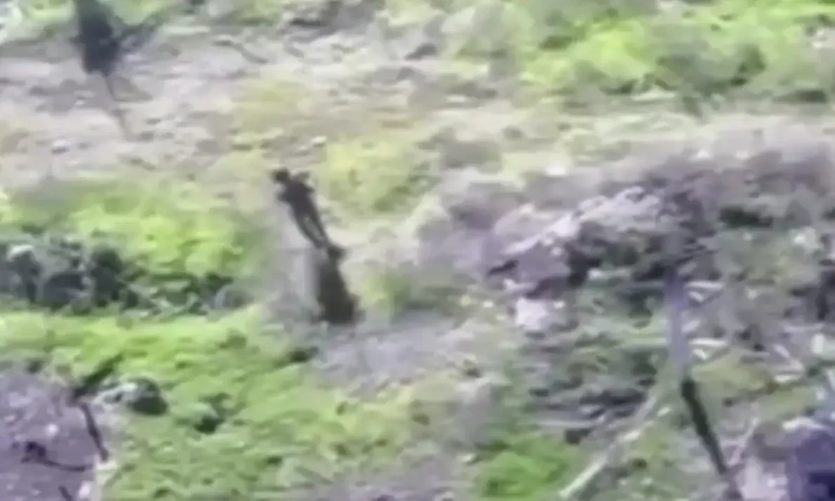 В какой-то момент беспилотник попросту врезается прямо в спину российскому солдату. Последний от удара падает на землю, но затем поднимается и бежит дальше. FPV-дрон же остается на земле.