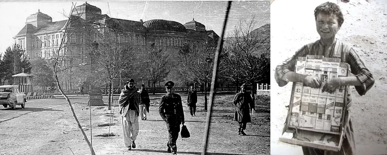 Дворец Дар-уль-Аман, справа от него — Генеральный штаб (виден фрагмент ограждения). Мальчишка — торговец, которые появились на улицах Кабула уже утром 28.12.1979.