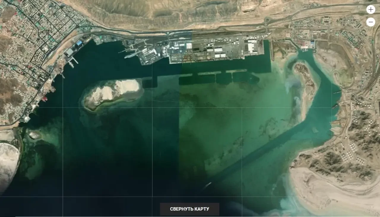 Спутниковый снимок уже с современным портом. Но кое-что из старой инфраструктуры осталось. Слева – Красноводск, справа – Уфра