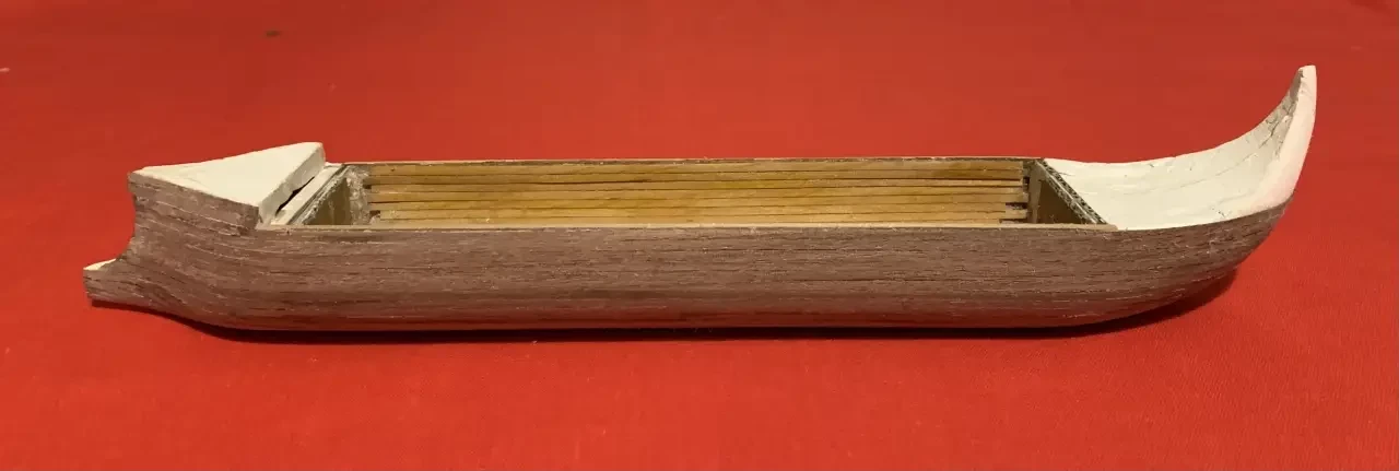 Начнём с того, что основой для такого корабля в то время вполне могла послужить монера – римский боевой корабль с одним рядом вёсел, каждым из которых гребло по нескольку человек. Основой корпуса такого корабля является полуцилиндр с надставленными бортами, что сильно упрощает изготовление модели.