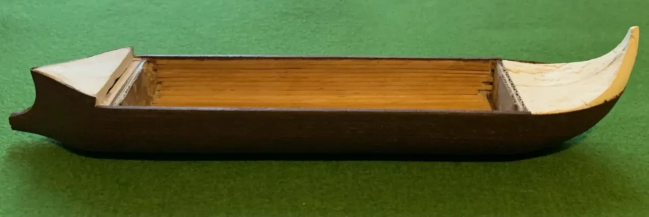 Сами стойки под модель – картонные конусы, вырезанные из упаковки для яиц, залитые эпоксидной смолой и раскрашенные под бронзу. Вёсла – китайские зубочистки. Перила – склеены из реек 2х2 мм. Красивые завитки на носовом фальшборте вырезаны из полистиролового веера, так же как и детали новогодней кареты, о которой здесь уже как-то рассказывалось. Глаза на носу нарисовать от руки представляется делом совершенно невозможным. Но их можно заказать в типографии, где делают термонаклейки, и перевести на место при помощи паяльника, поставленного на самый малый нагрев.