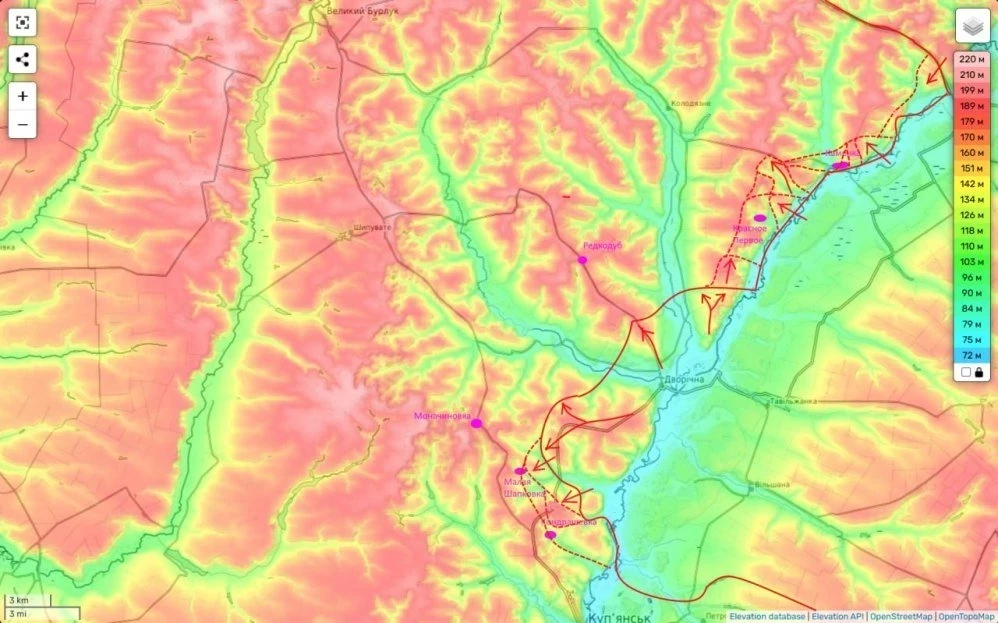 Таким образом весь западный берег реки Оскол севернее Купянска теперь находится под контролем ВС РФ. Теперь надо отбросить части противника на запад, чтобы сухопутный коридор к Двуречному плацдарму стал и логистическим.