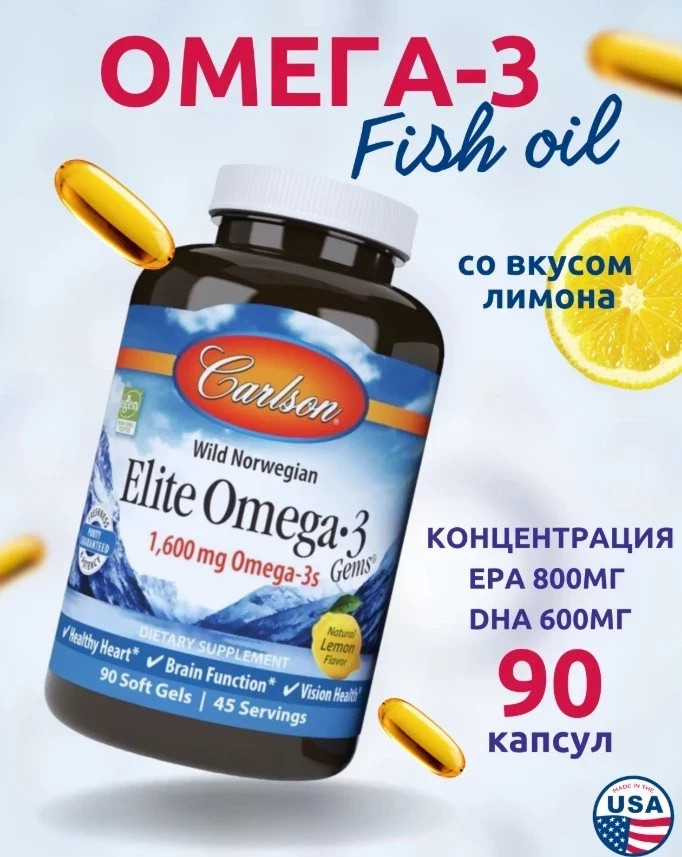 Elite Omega-3 Gems от Carlson Labs — это высококачественный концентрат рыбьего жира с лимонным вкусом, который стал одним из топ американских бадов. Каждая порция содержит 1600 мг Омега-3, включая ЭПК и ДГК, которые поддерживают здоровье сердца, мозга, суставов и зрения. Рыбий жир поступает от экологически чистой холодноводной рыбы, что гарантирует максимальную свежесть и высокую эффективность. Продукт помогает улучшить артериальное давление, снизить воспаление и поддерживать нормальный липидный обмен.