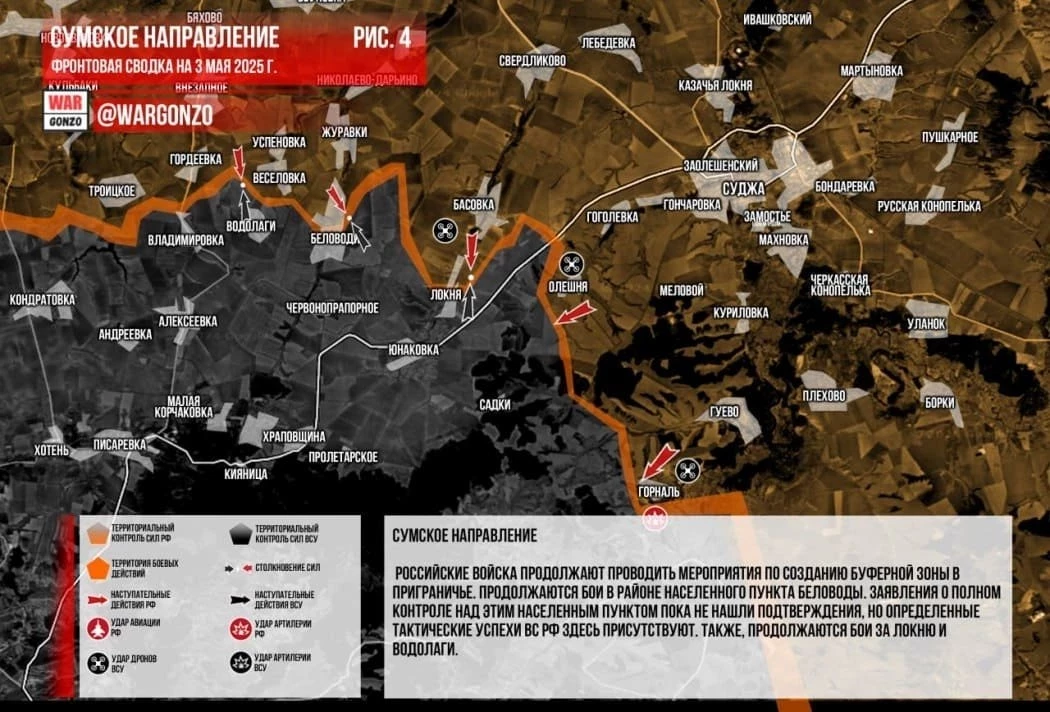В свою очередь Telegram-канал Wargonzo информирует о том, что российские войска продолжают проводить мероприятия по созданию буферной зоны в приграничье.