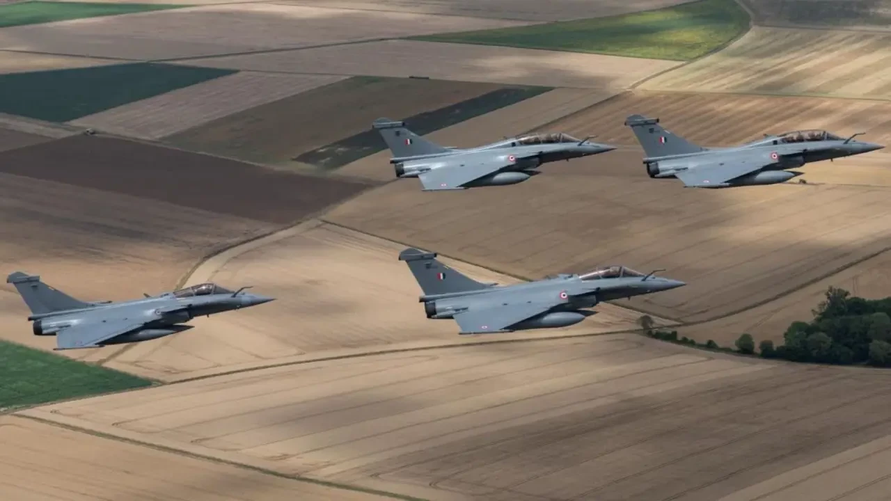 Три самолёта ВВС Индии и один самолёт Rafale французских ВВС и космических войск тренируются в небе Франции в июле 2023 года перед предстоящим парадом в честь Дня взятия Бастилии
