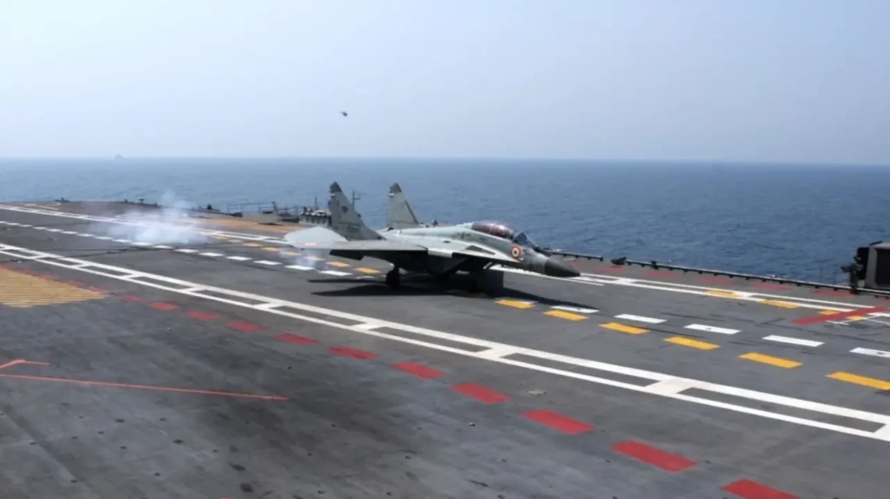 Истребитель МиГ-29К ВМС Индии совершает первую посадку на авианосец INS Vikrant 6 февраля 2023 года